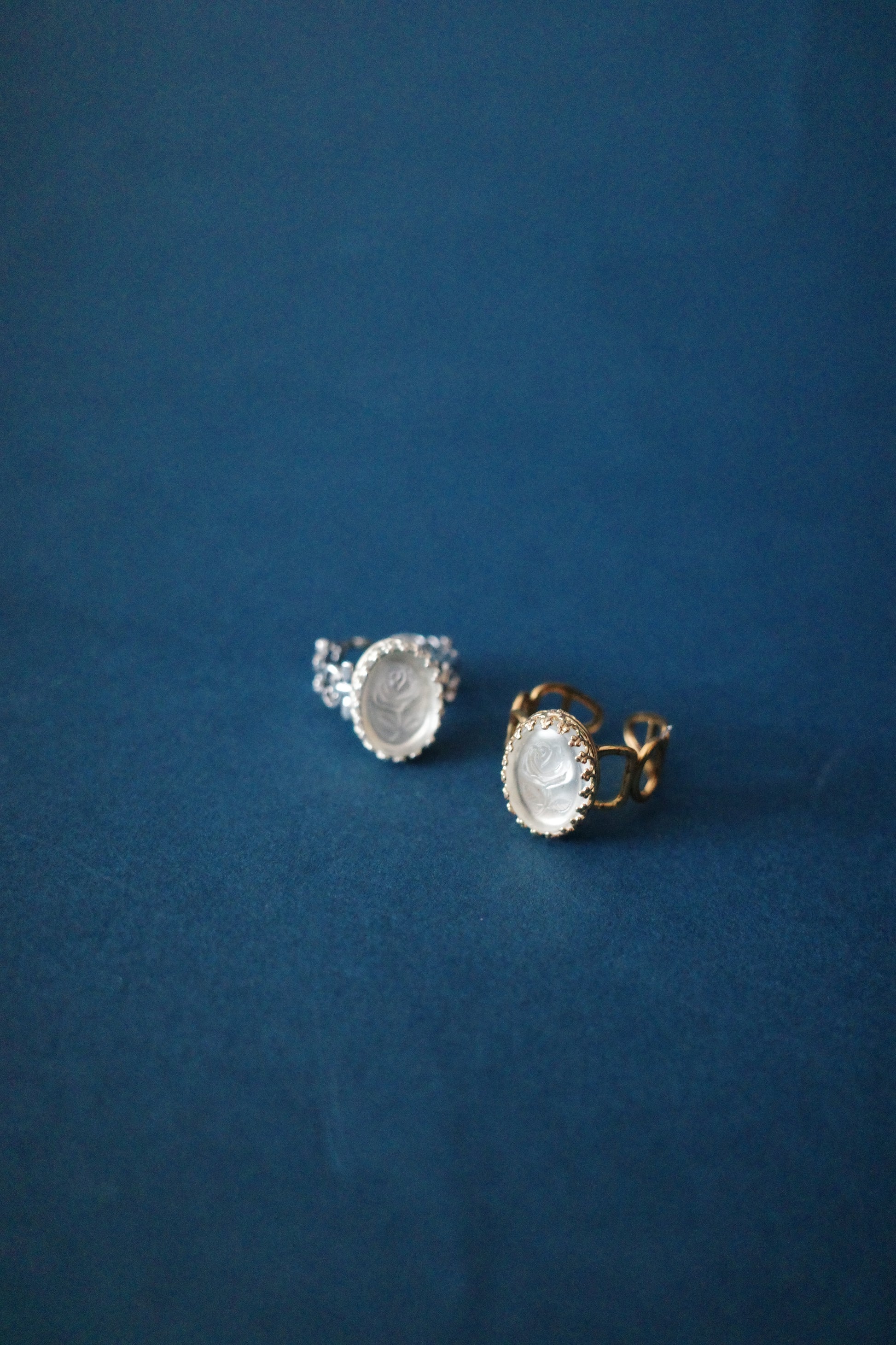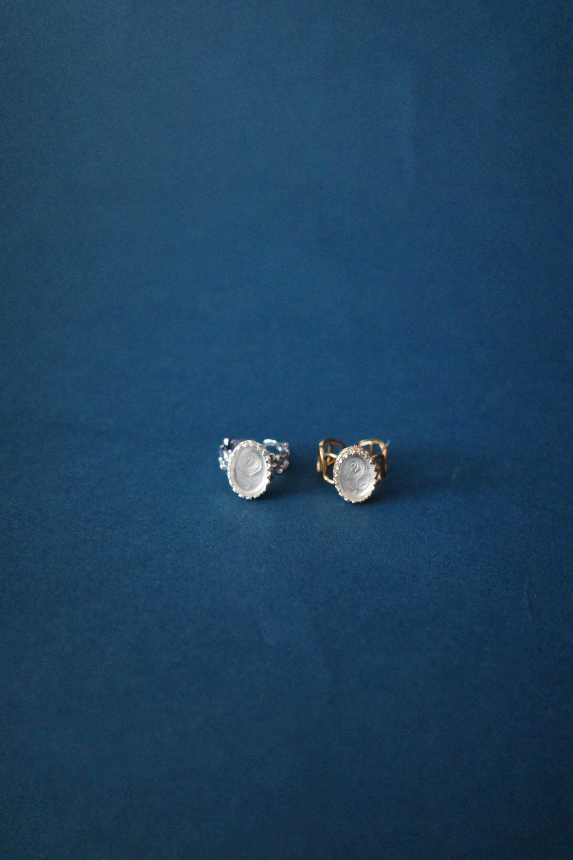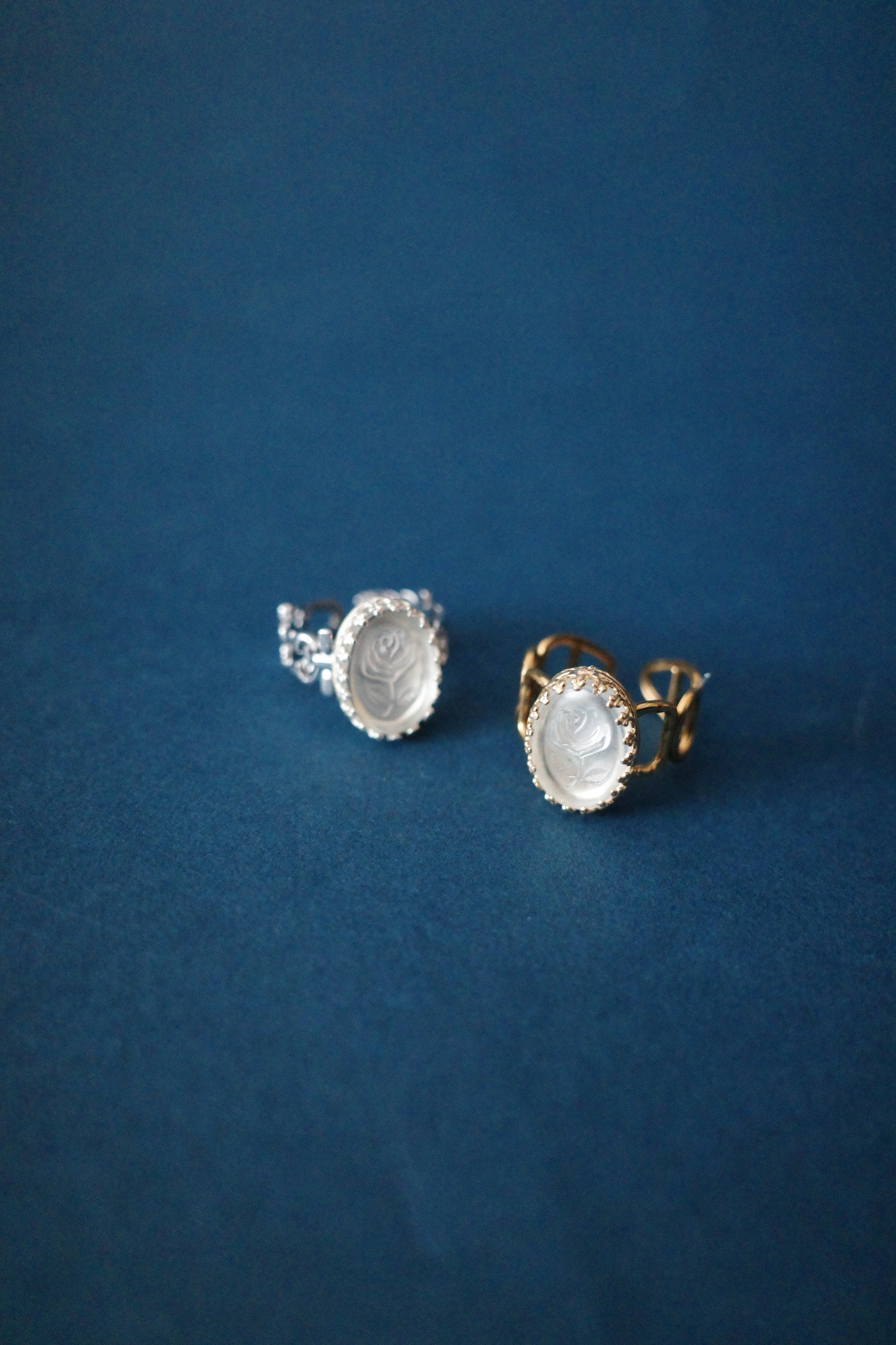 リングボディは、その時々のデザイン。今回はフープゴールドと紋章シルバーの2種類をご用意しました。