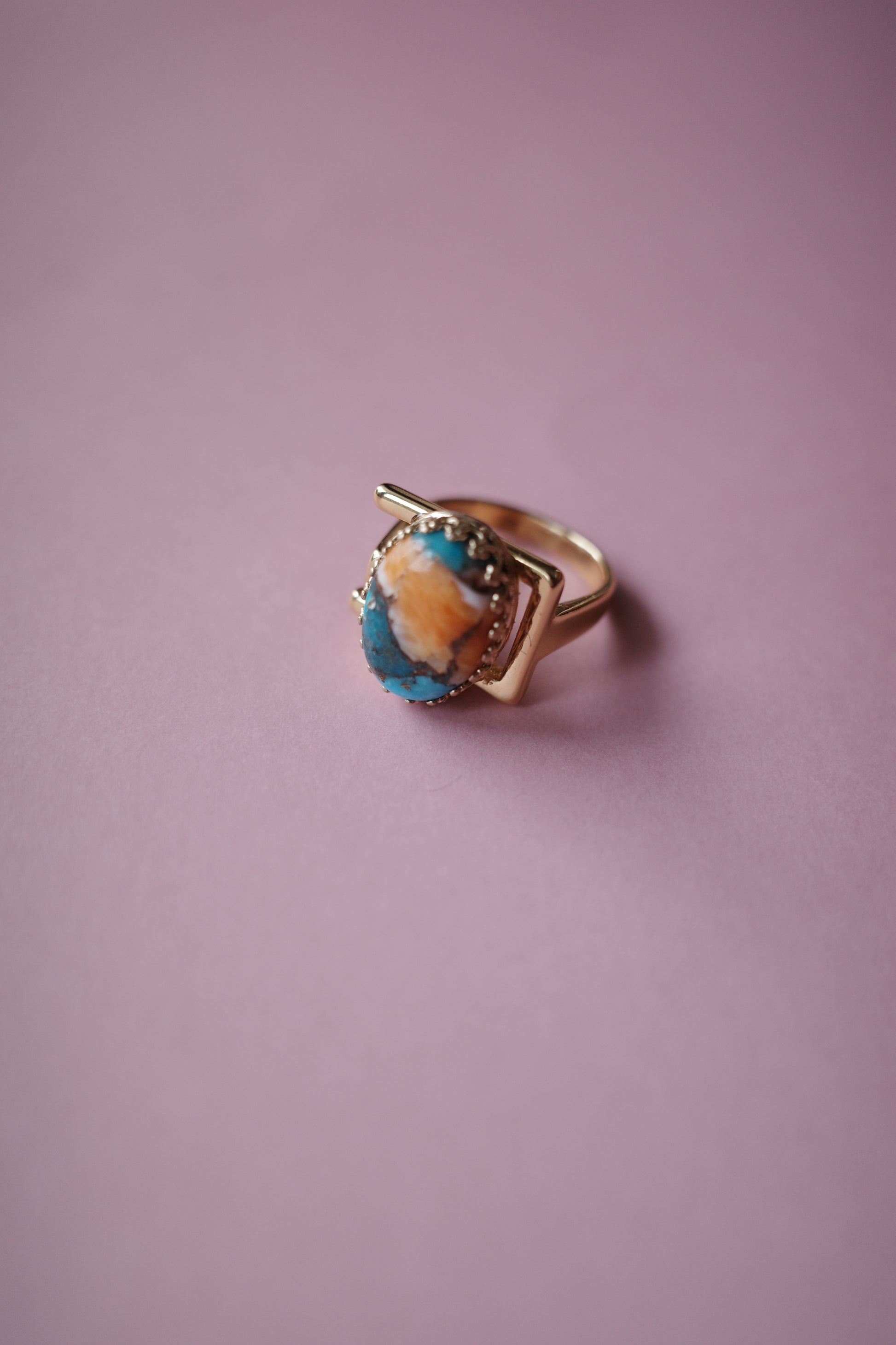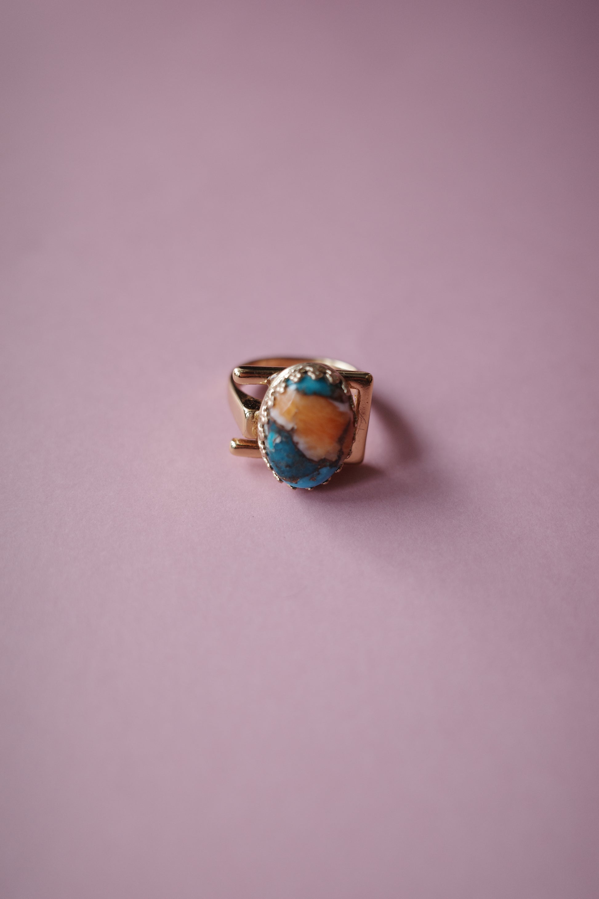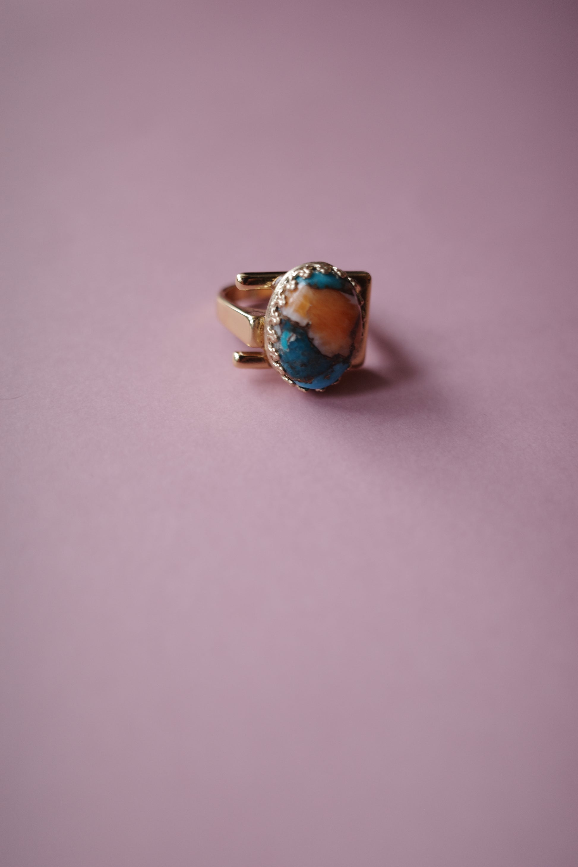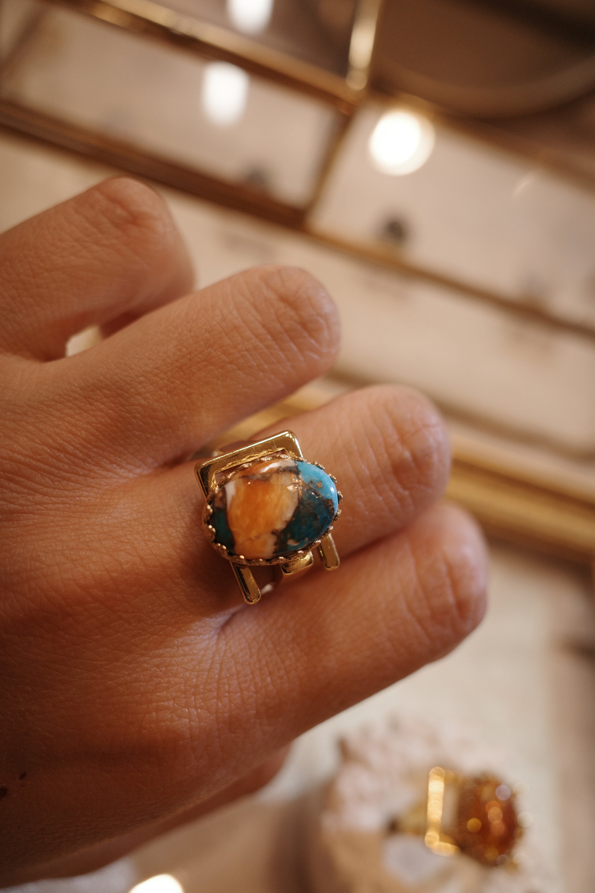 天然石のターコイズやアマゾナイト、オイスターシェルを金継ぎのようにあわせた、秋の実のようにクラシックで美味しそうなコッパーデザインをセッティングしました。