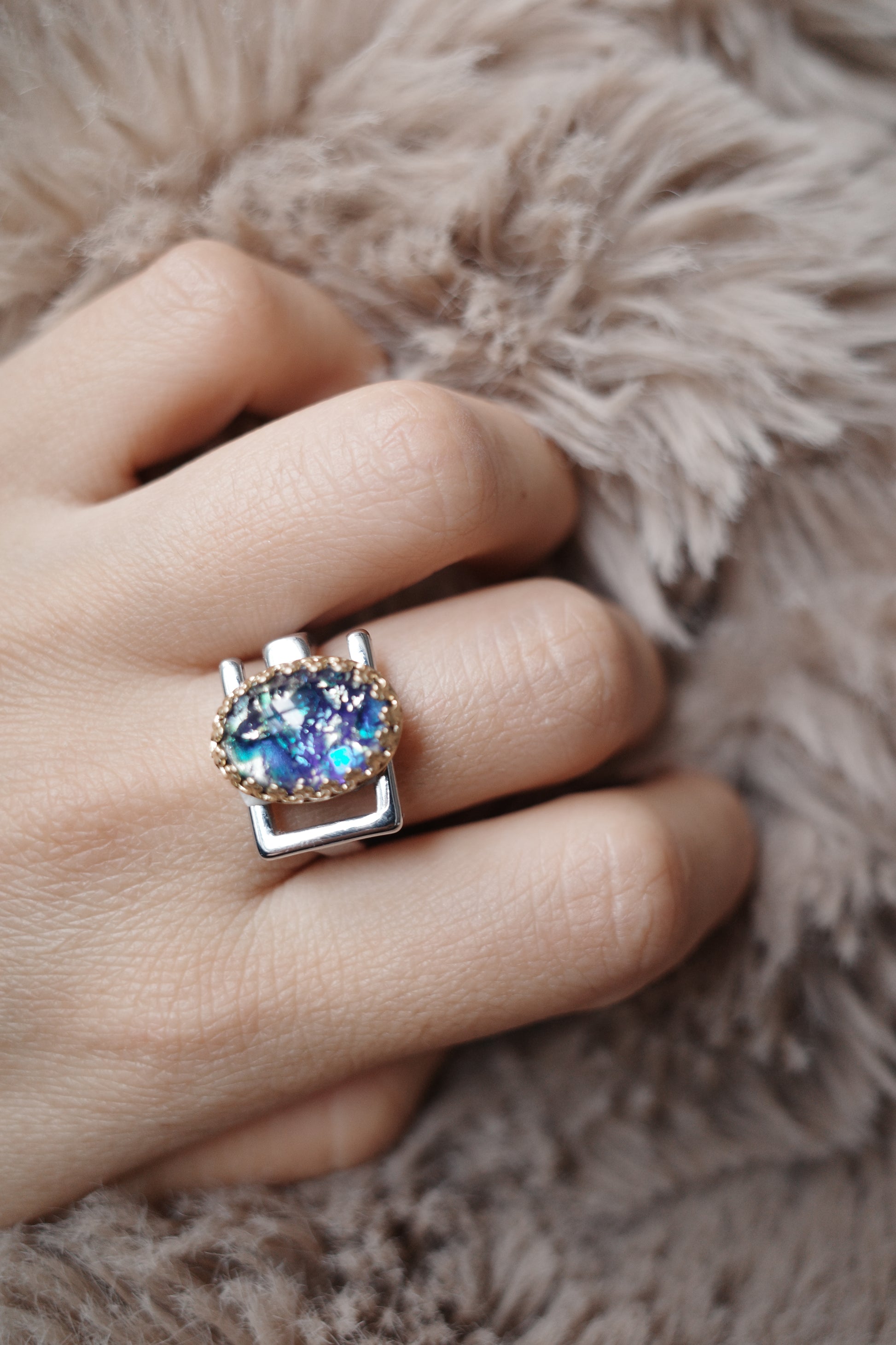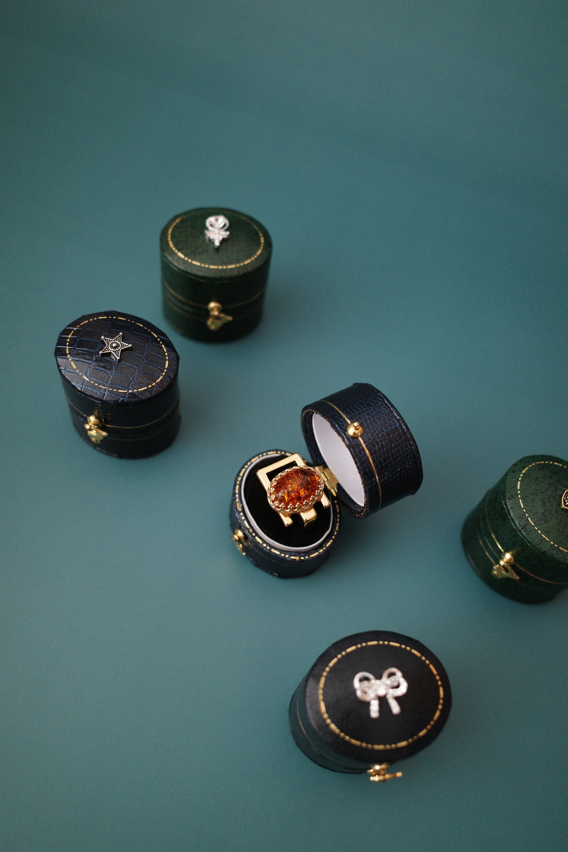 落ち葉が美しく舞う秋のロンドンの公園を彷彿とさせるような美しい模様の天然石、「バルティックアンバー」(琥珀)をセッティングしました。