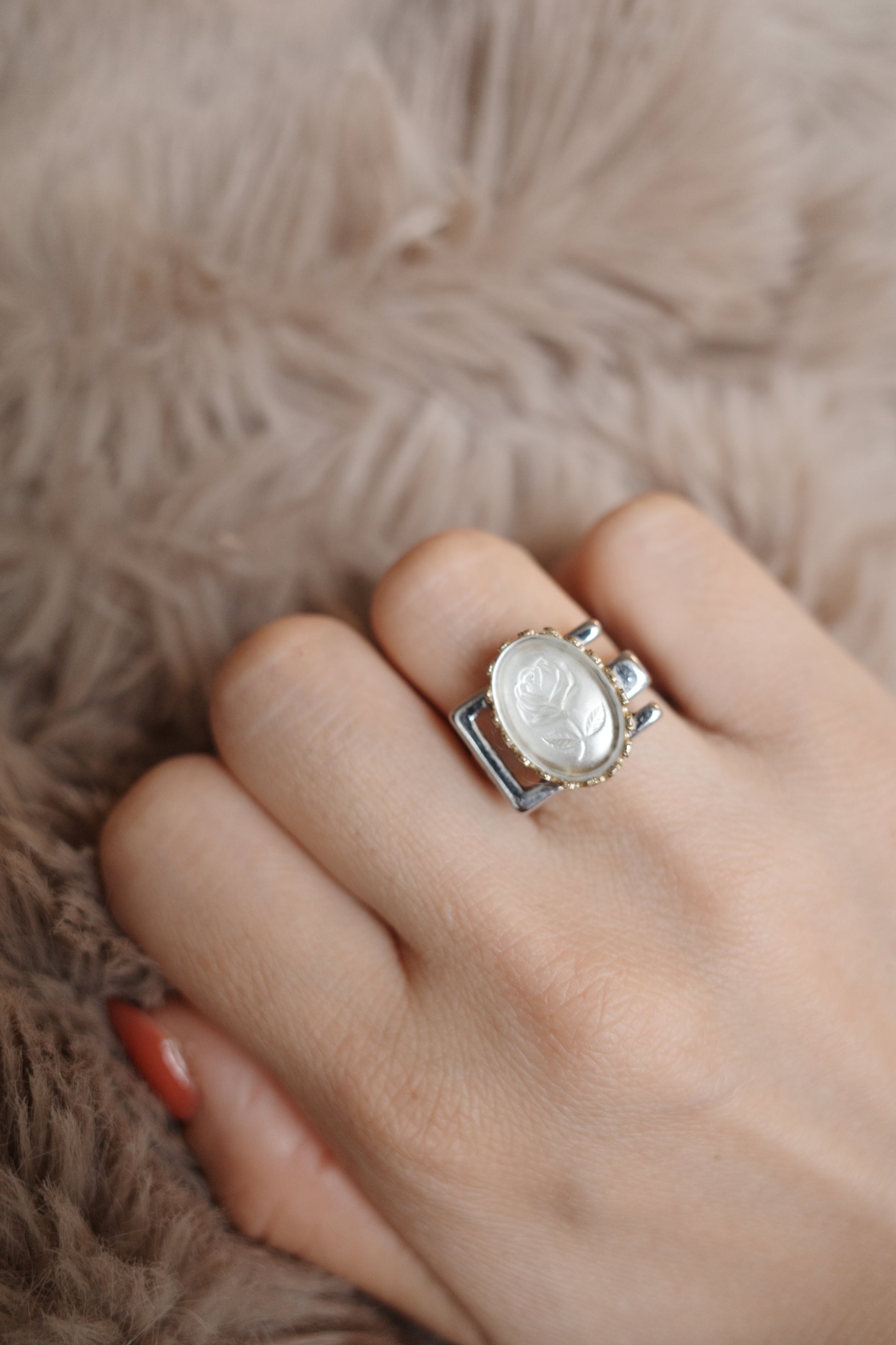 ユニセックス風なデザインですが、指にはめてみるととてもすんなりなじみ、モードな美しい手元を演出してくれます。