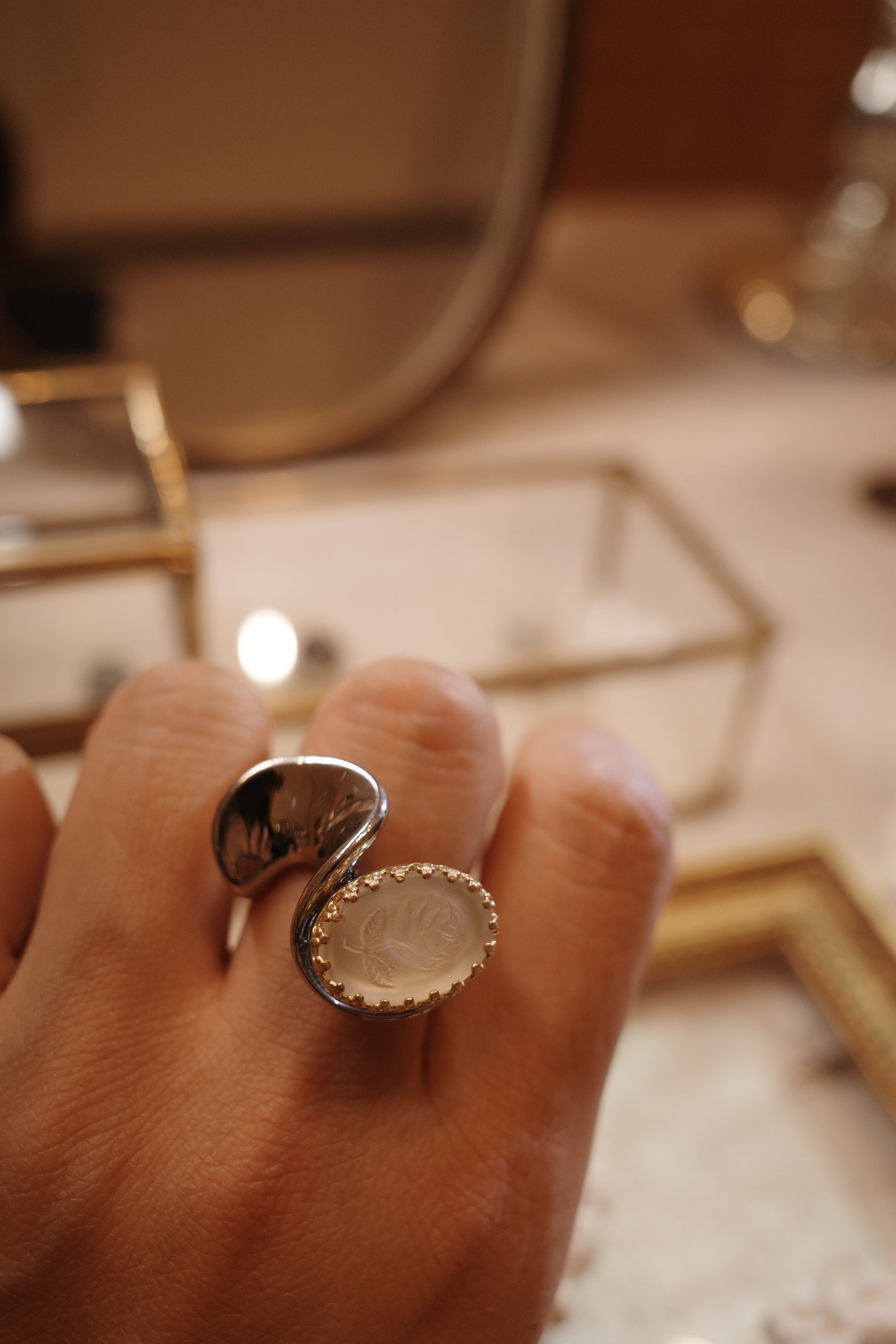 こちらのフリルリングは、2つの大胆なフリルが指のラインにすっと沿ったデザインで、つけてみた時にかなりなじみのよさを感じるフォルムになっております。