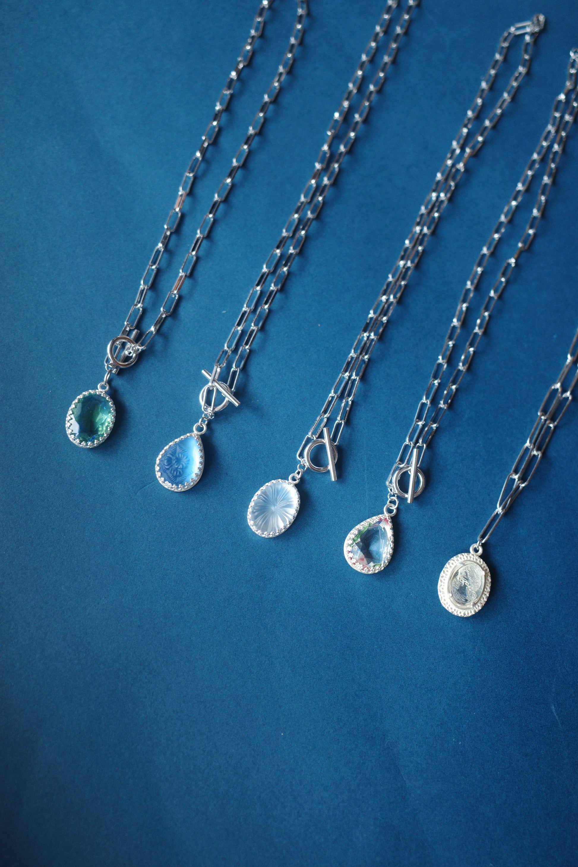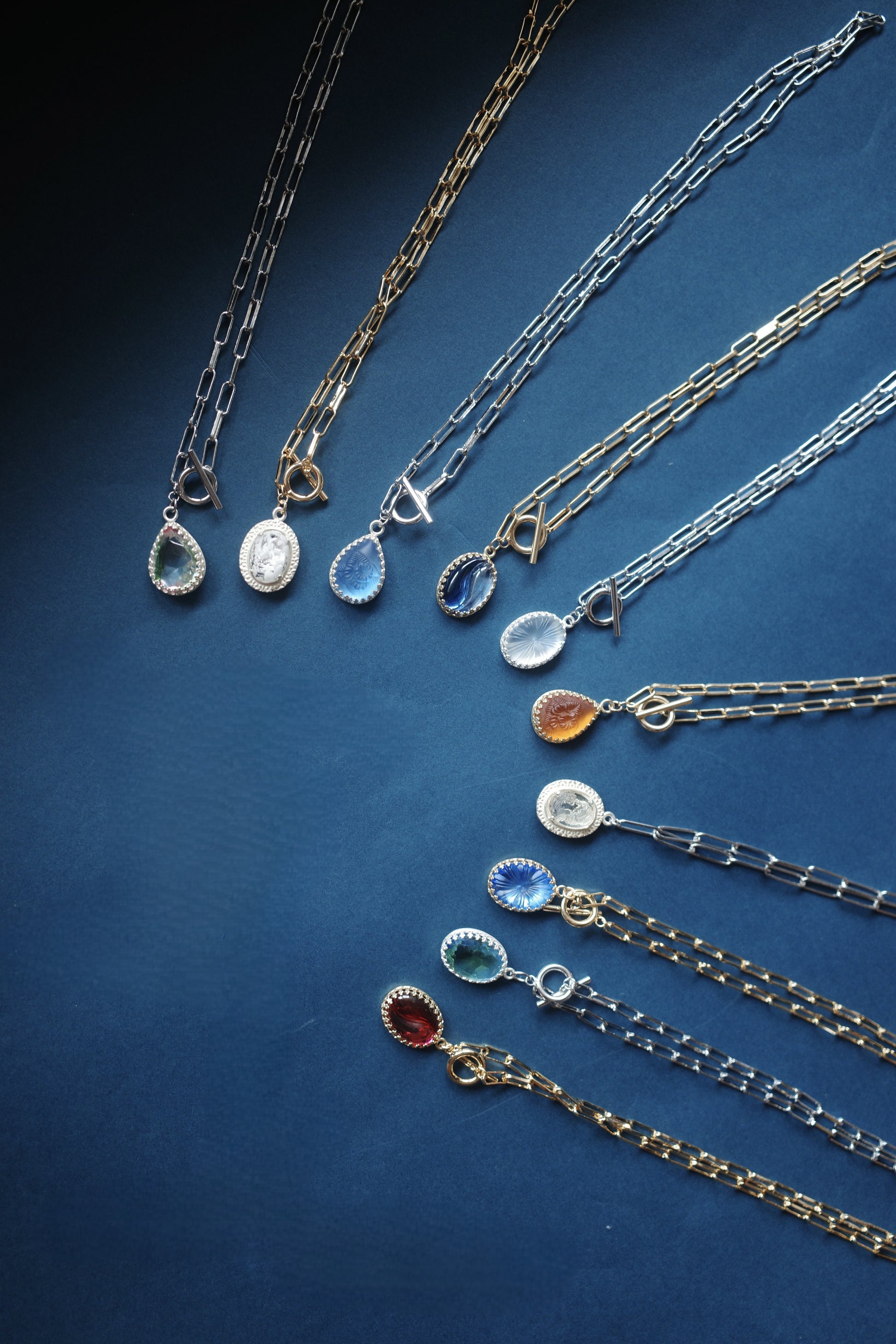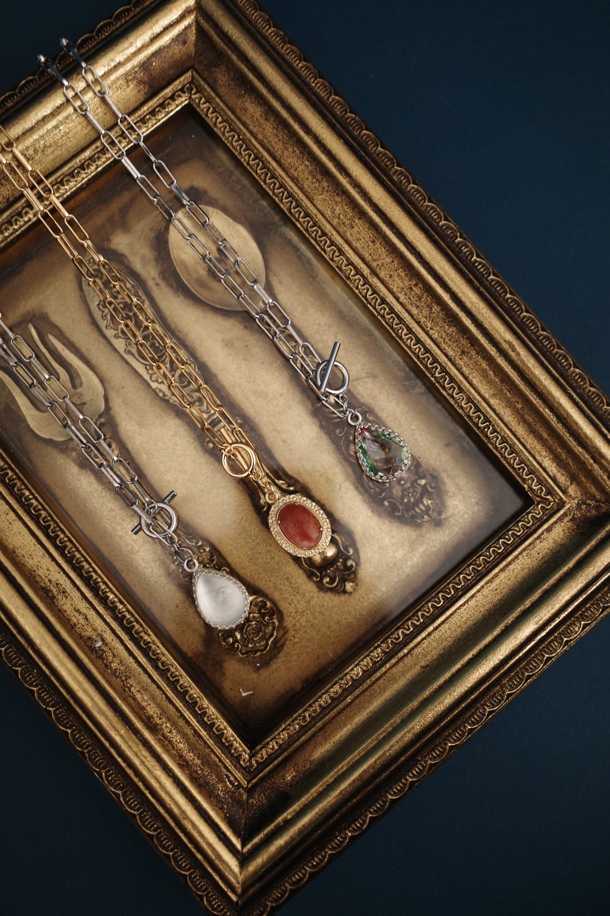 ストーン部分はクラシックなヴィンテージデザインながら、チェーンネックレスに仕立てることで秋冬のモードなコーデを楽しんでいただけます。