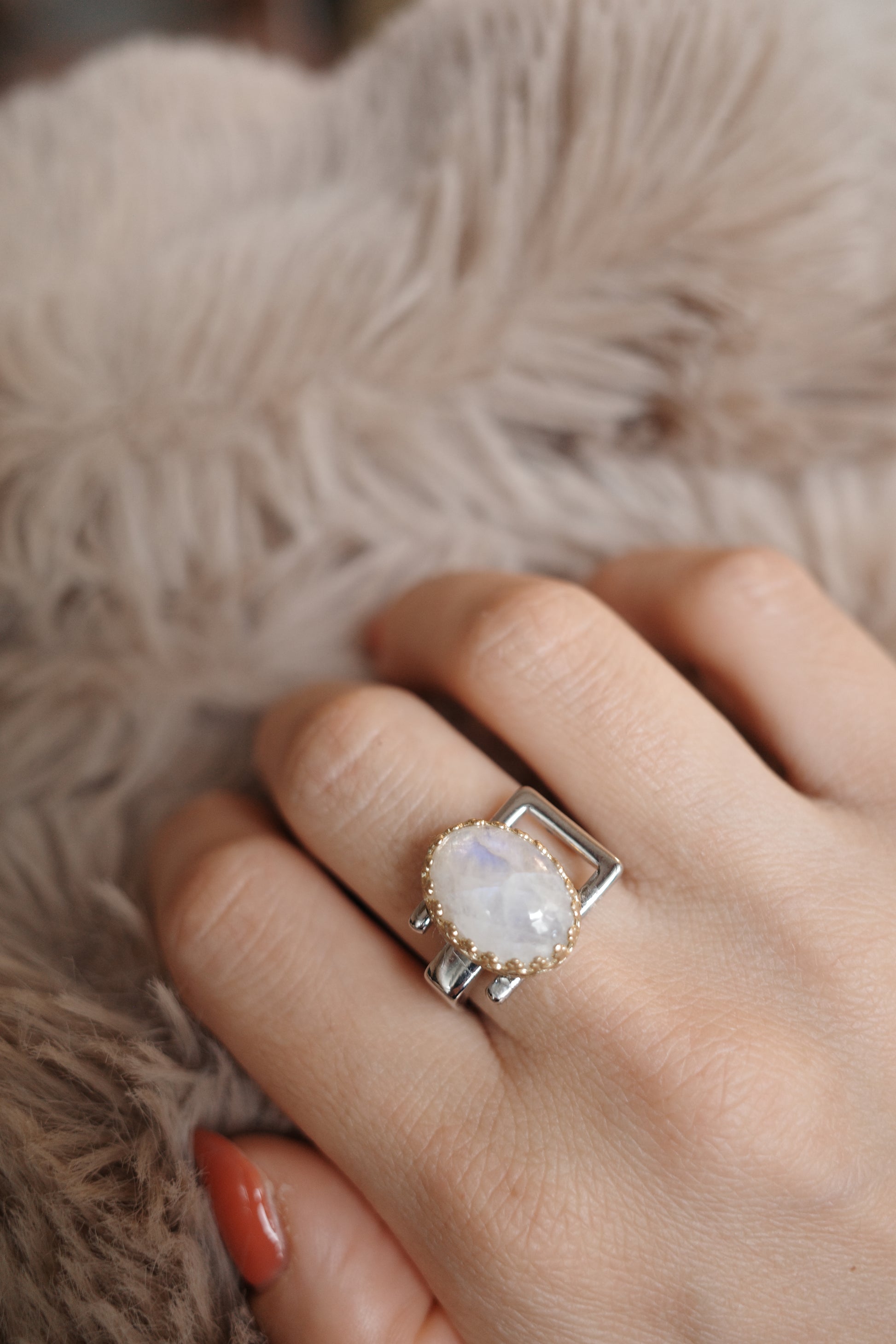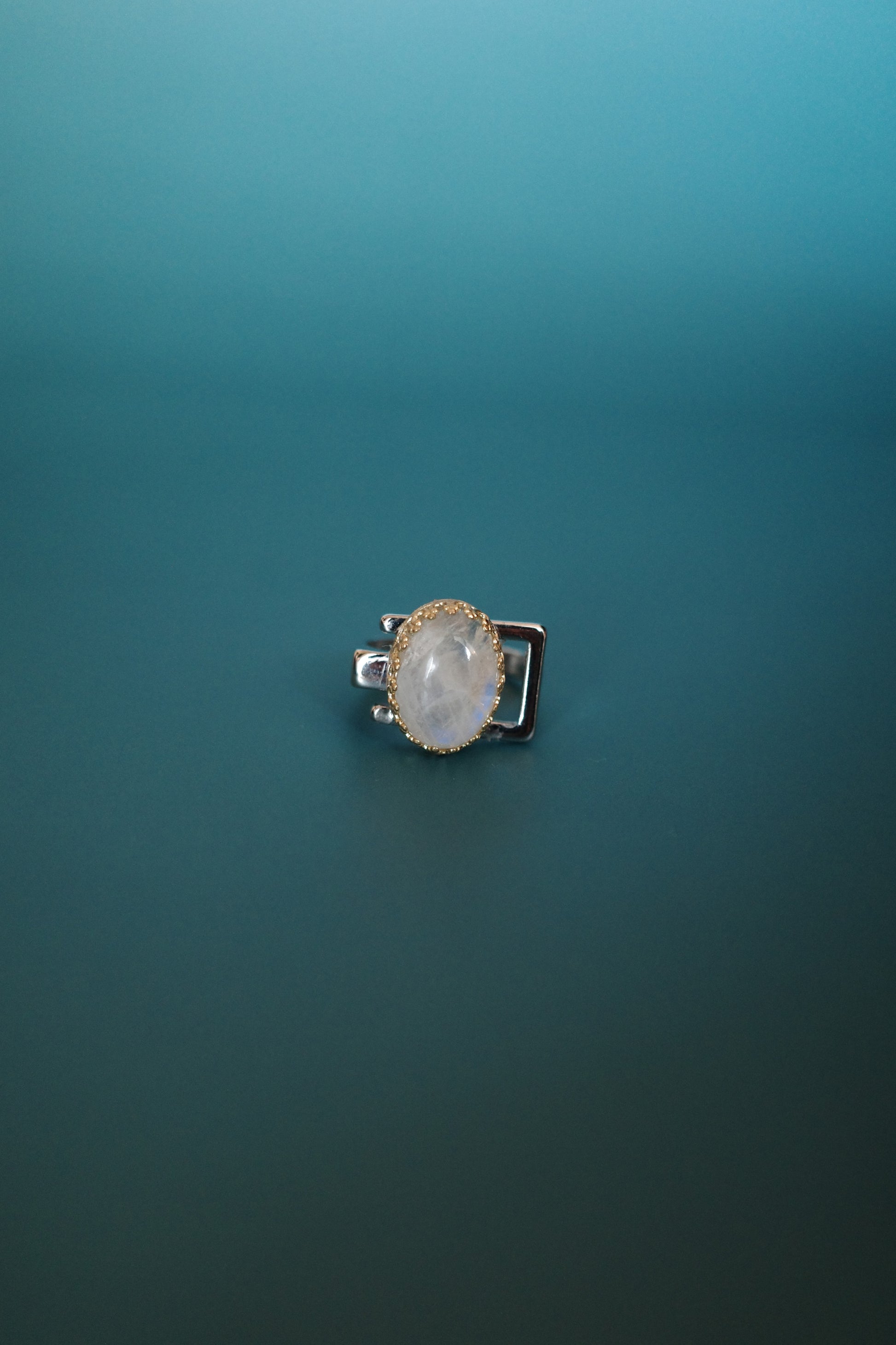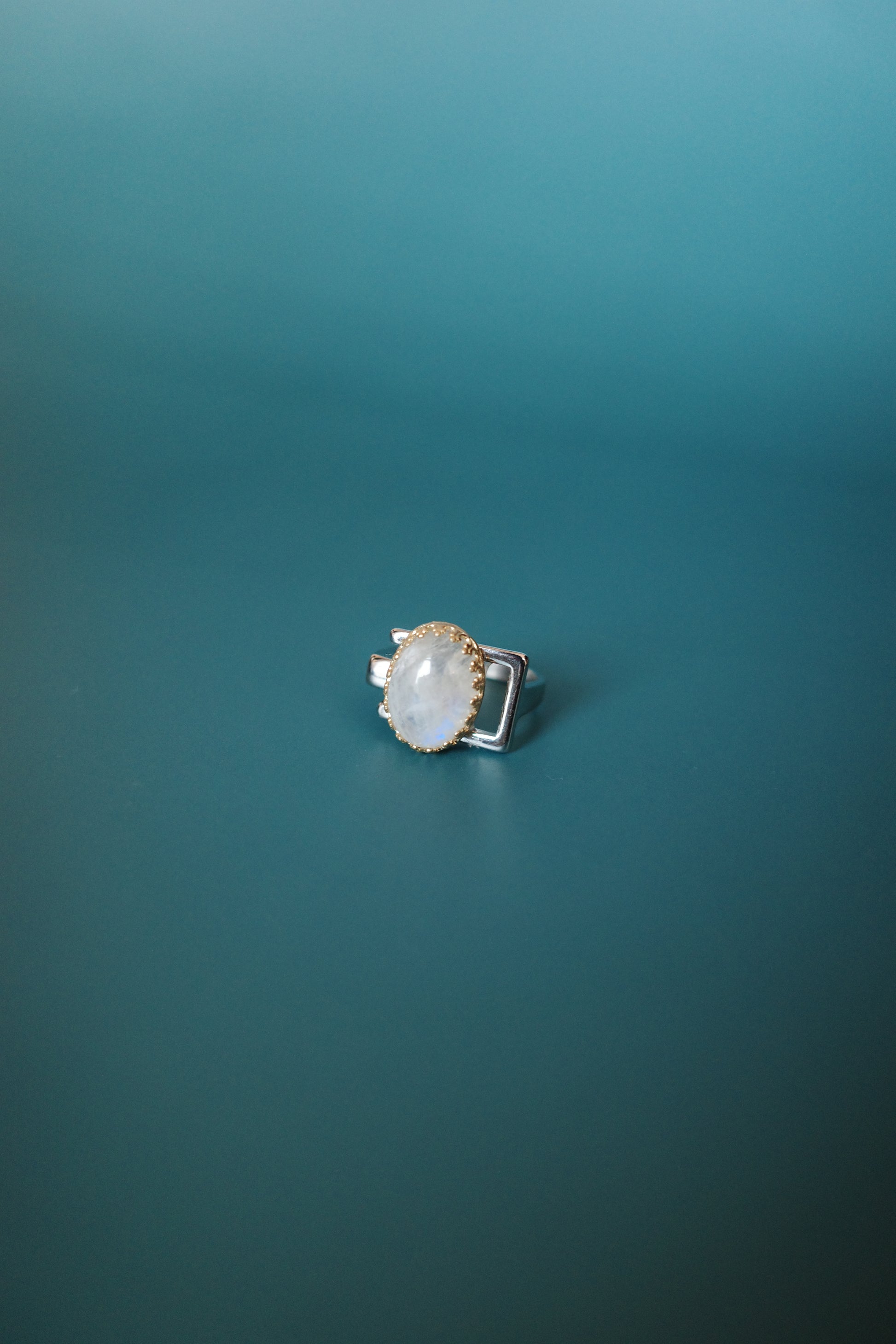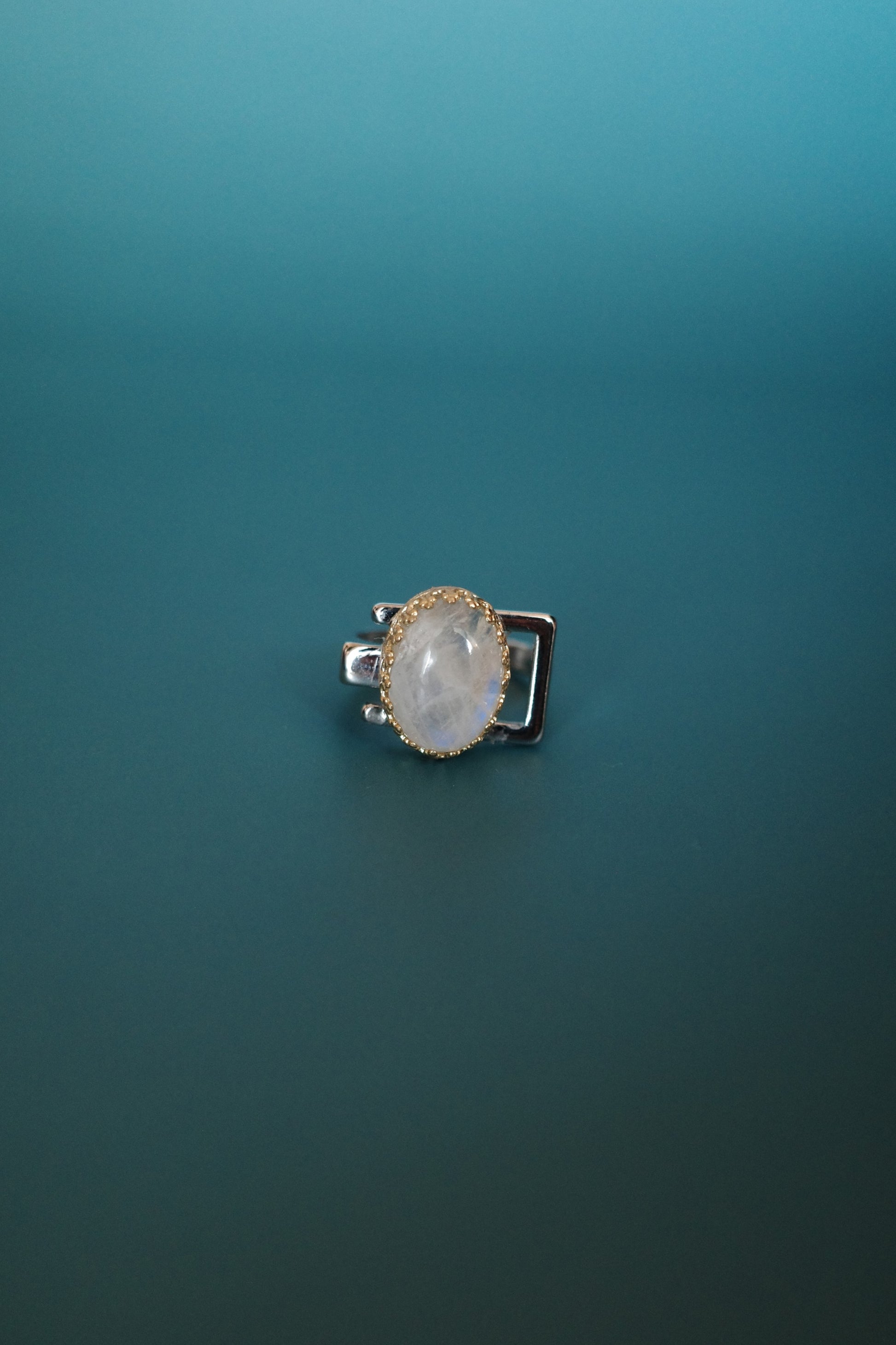 角度によって美しい青のシラーが見える天然石「レインボームーンストーン」をセッティングしました。