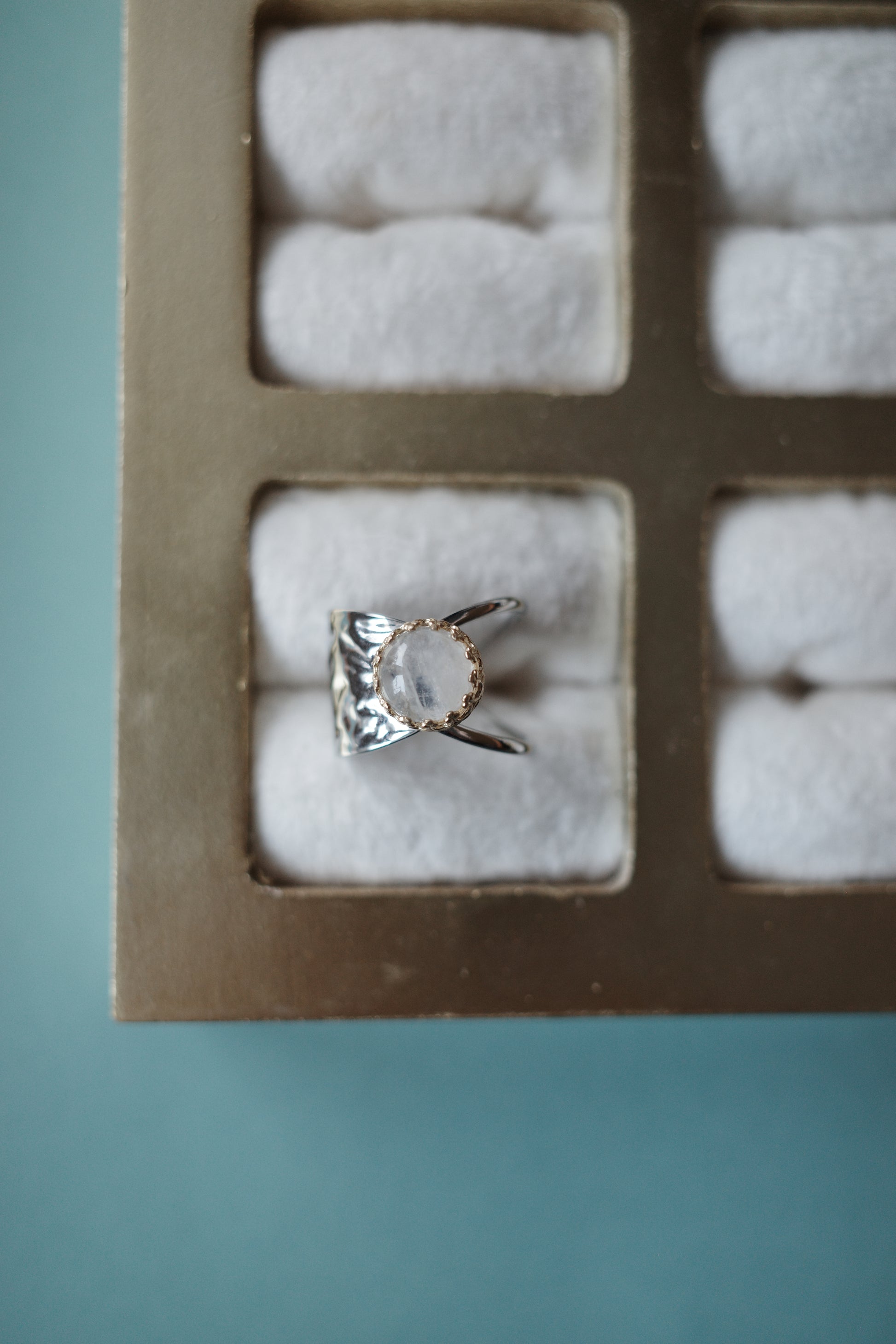 こちらの「月代」(つきしろ)は、月がのぼる前に白んでゆく東の空をイメージしたデザイン。レインボームーンストーンをはめこんでいます。